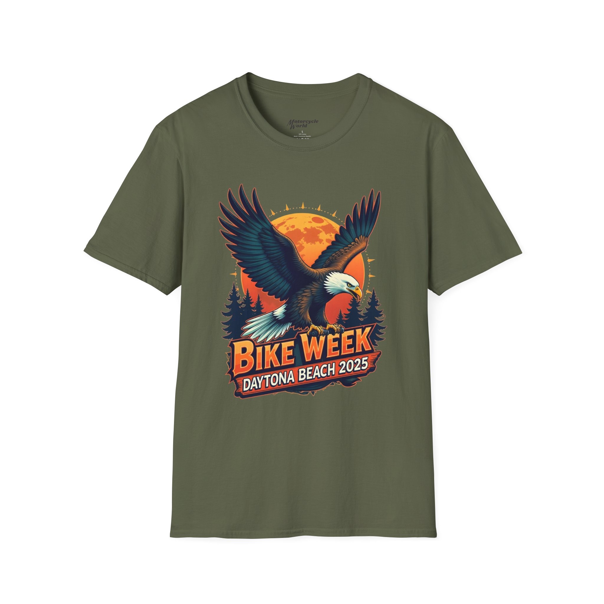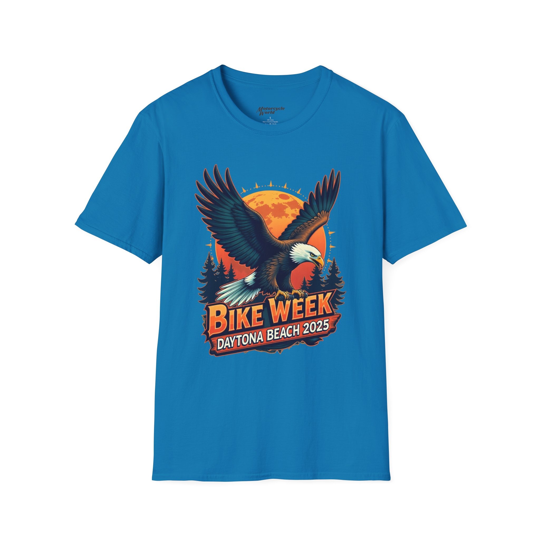 Celebrate Bike Week Daytona Beach 2025 with this Flying Eagle front design T-Shirt. Made from 100% ring-spun cotton, this lightweight and durable shirt is perfect for everyday wear. The classic fit and crew neckline make it suitable for any occasion, from casual outings to special events. Ideal for adults and motorcycle enthusiasts.